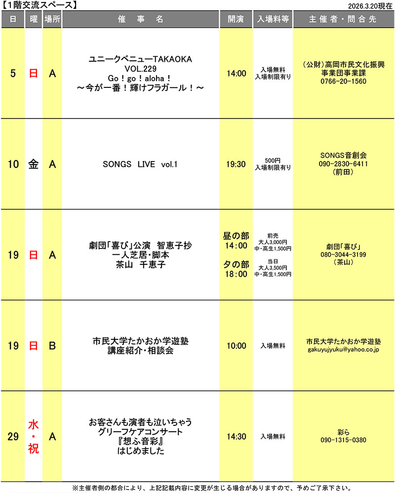 1階交流スペース・広場公園…令和8年4月の催し物カレンダー
