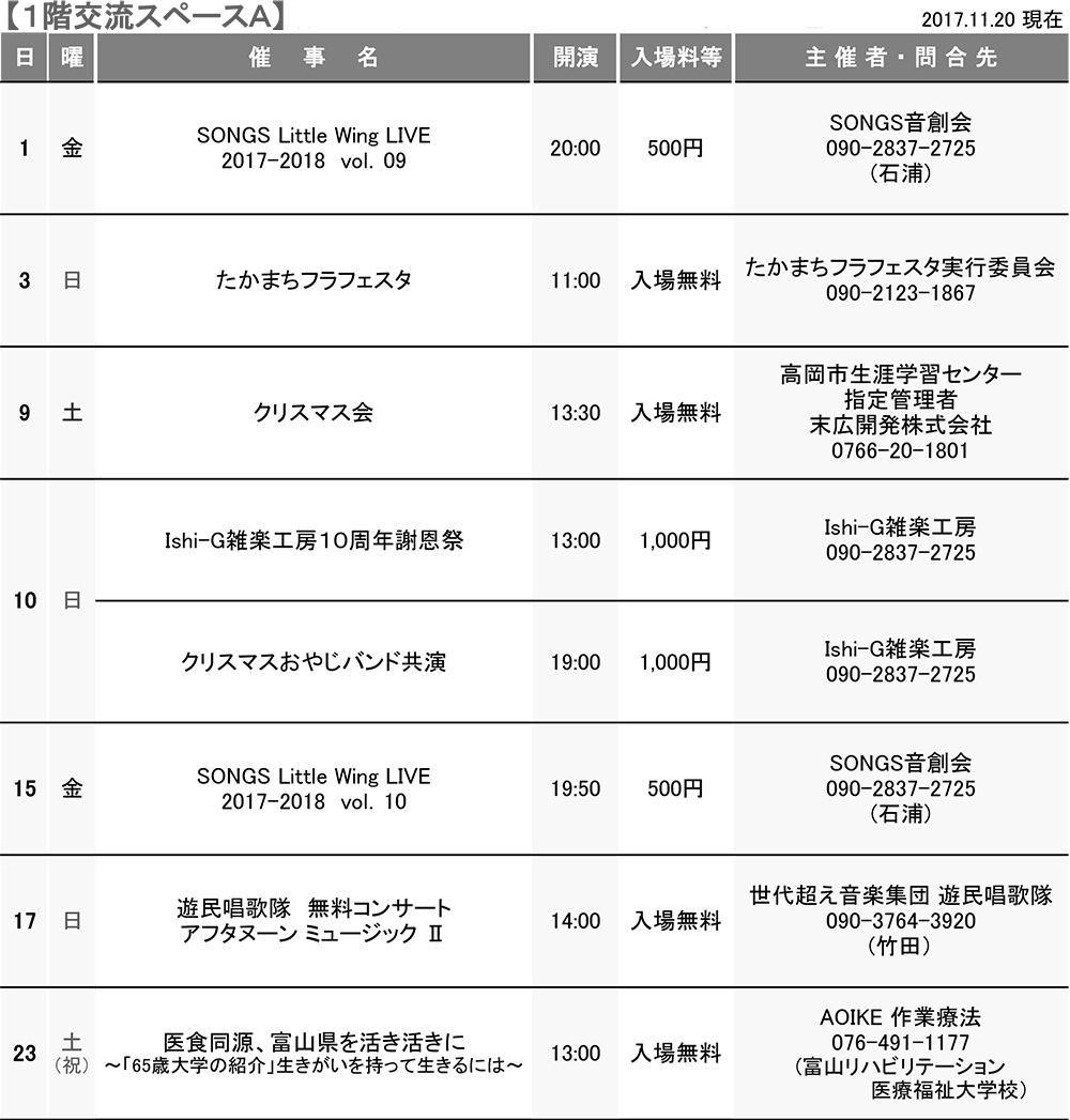 1階交流スペース・広場公園…平成29年12月の催し物カレンダー