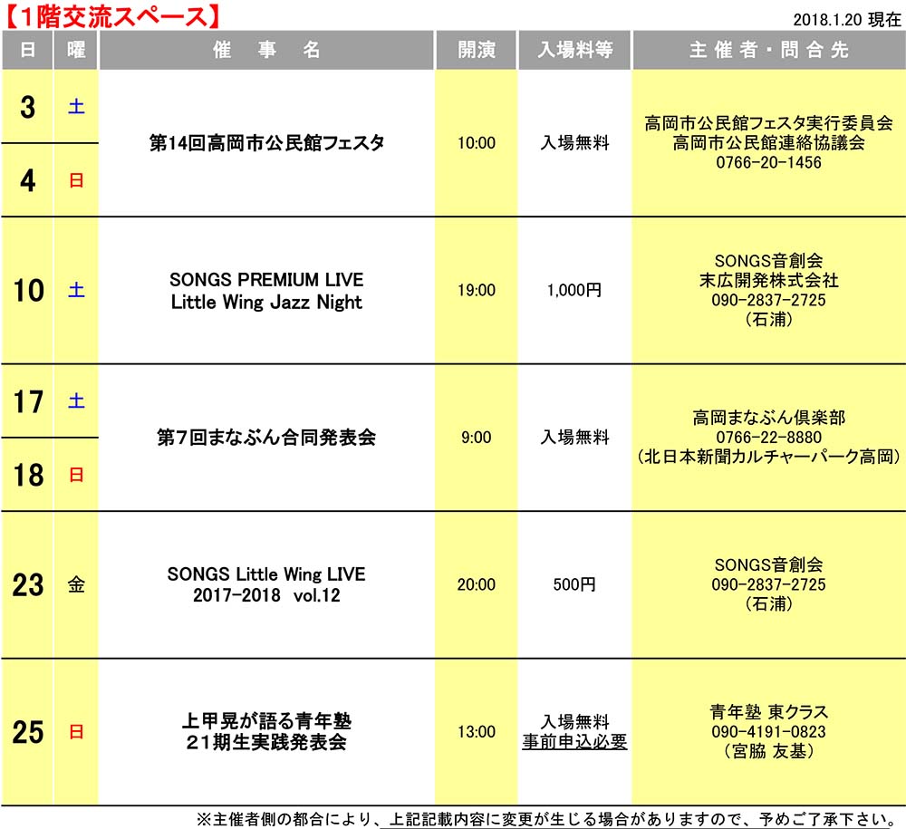 1階交流スペース・広場公園…平成30年2月の催し物カレンダー