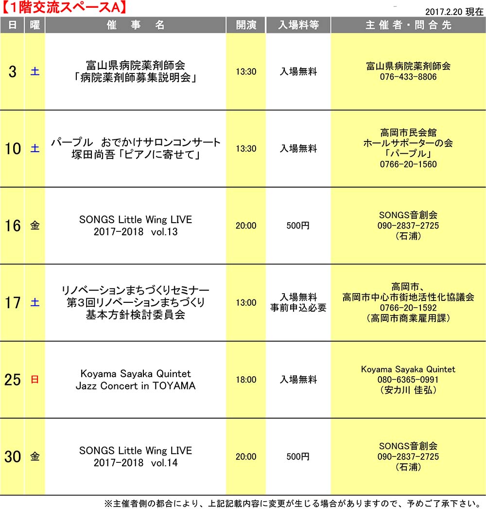 平成30年2月の催し物カレンダー