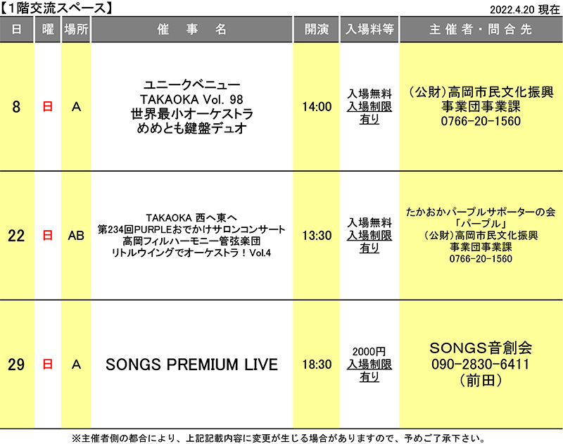 1階交流スペース・広場公園…令和4年5月の催し物カレンダー