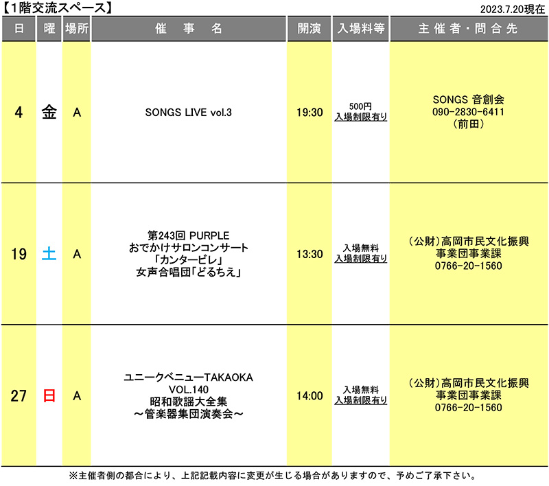 1階交流スペース・広場公園…令和5年8月の催し物カレンダー
