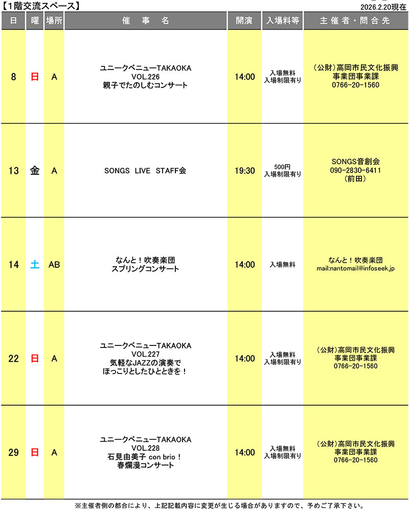 令和8年2月の催し物カレンダー