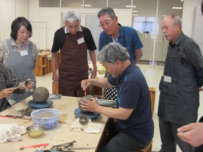 受講生のみなさんで釜出しをした後、先生から講評をいただきました。「まずは『形をつくる・形にこだわる』こと。そして『楽しみながらつくる』ことを大事に」という先生のお話がありました。 |